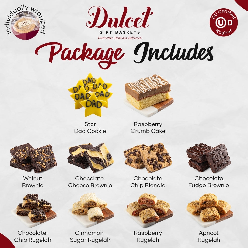 xCelebrate the special man in your life with our "#1 Dad Star Cookies Gift Box," a delightful assortment of gourmet treats perfect for Father's Day or any occasion. This elegant package features a handpicked selection of scrumptious rugelach, decadent brownies, and a moist crumb cake, each brimming with rich flavors that will tantalize Dad's taste buds. The highlight of this collection is the beautifully crafted star-shaped cookies, adorned with vibrant yellow icing proudly proclaiming "#1 Dad." These cookies are a sweet, edible tribute, akin to sending your dad a standing ovation. Treat your father to this unique and heartfelt gift, and let him indulge in a taste experience that truly celebrates his greatness.