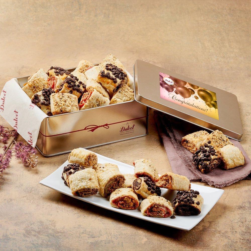 xIndulge in the irresistible allure of gourmet rugelach, where buttery, melt-in-your-mouth pastries await in a beautifully presented tin. Each flaky pinwheel is a delightful burst of flavor, featuring a harmonious blend of charming cherry, decadent chocolate explosion, and aromatic cinnamon spice. This stunning gift, elegantly wrapped with a satin ribbon adorned with our logo, is perfect for making a lavish impression on any occasion. Experience the symphony of sweetness with this exquisite assortment of rugelach, sure to delight any dessert lover.