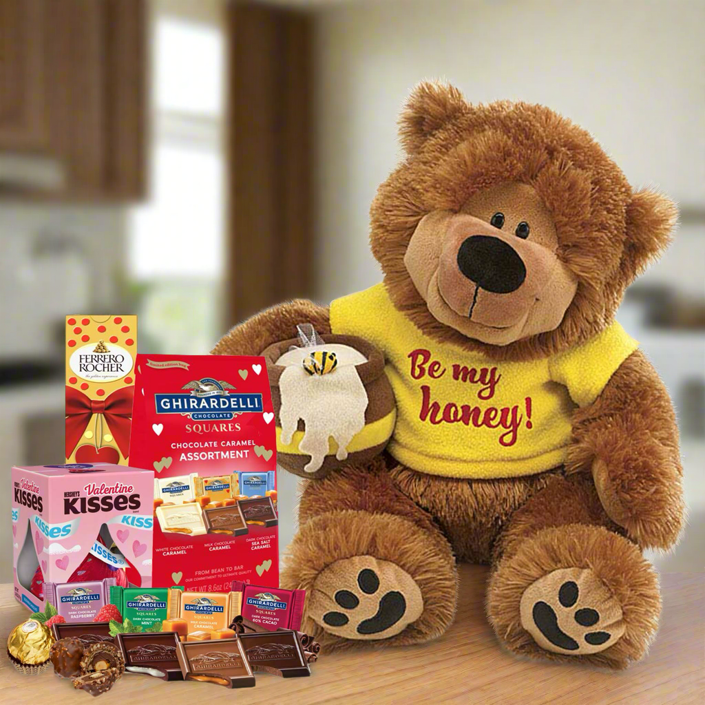 18" plush Be My Honey Teddy Bear, 8.6 oz assorted Ghirardelli squares chocolates, Ferrero Rocher Fine Hazelnut Milk Chocolate 5 Count in a Valentine's Day Candy Gift Box, HERSHEY'S, KISSES Solid Milk Chocolate Candy, Valentine's Day, 1.45 oz, Gift Box