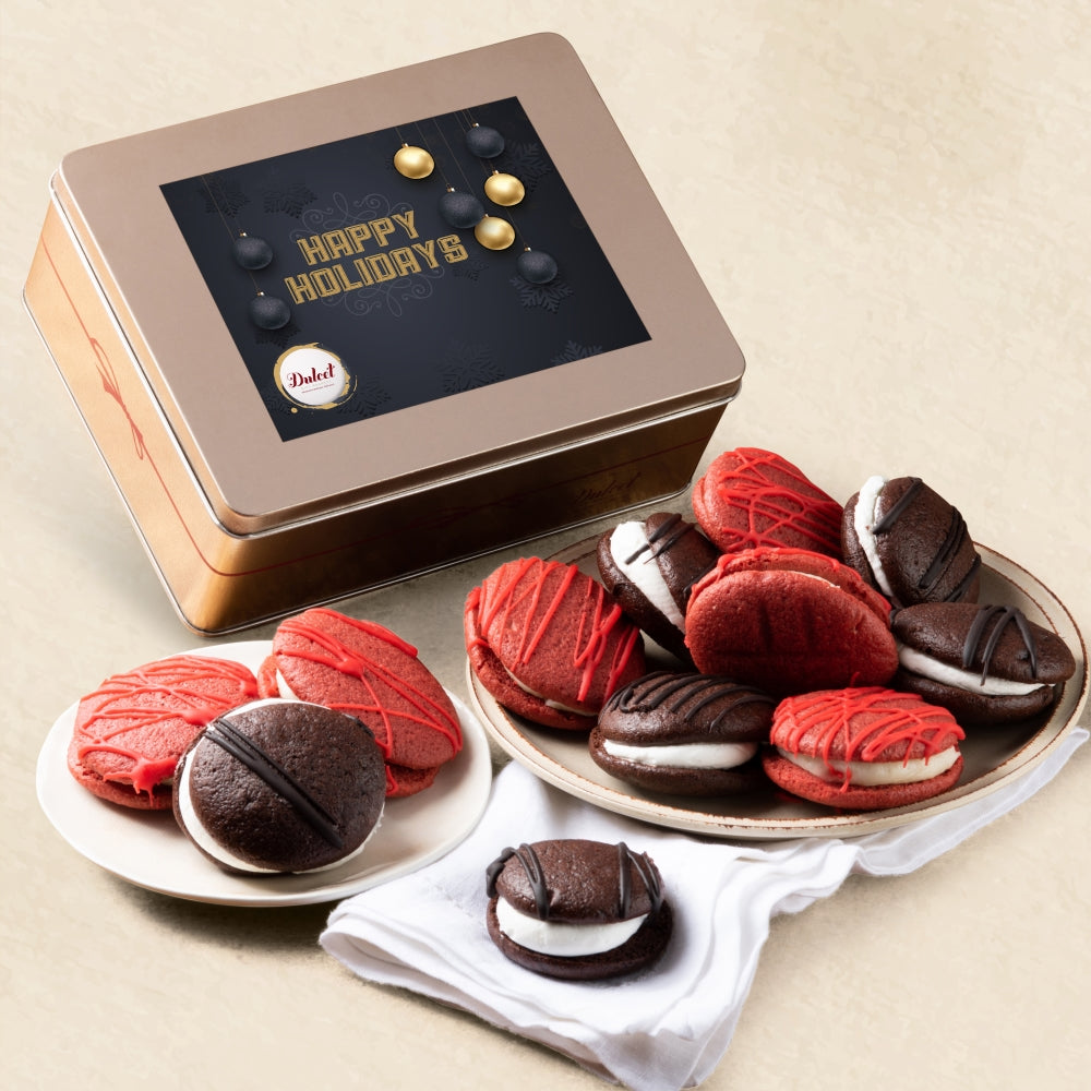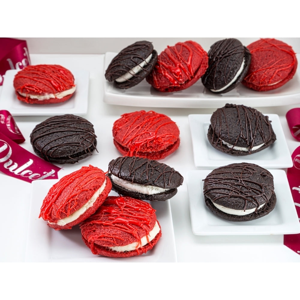 Discover the ultimate indulgence with our gourmet whoopie pies, crafted from the finest ingredients for a taste sensation that's truly out of this world. Each delectable whoopie pie features spongy cookies made with farm-fresh eggs and pure chocolate boasting 70% cocoa, perfectly paired with a refreshing hint of mint. These handcrafted desserts are elevated by a generous layer of rich, hand-whipped cream, creating the perfect balance of flavors and textures. Dulcet's exclusive collection of chocolate mint whoopie pies makes an irresistible best-seller gift, perfect for any occasion. Treat yourself or someone special to this exquisite dessert experience today!