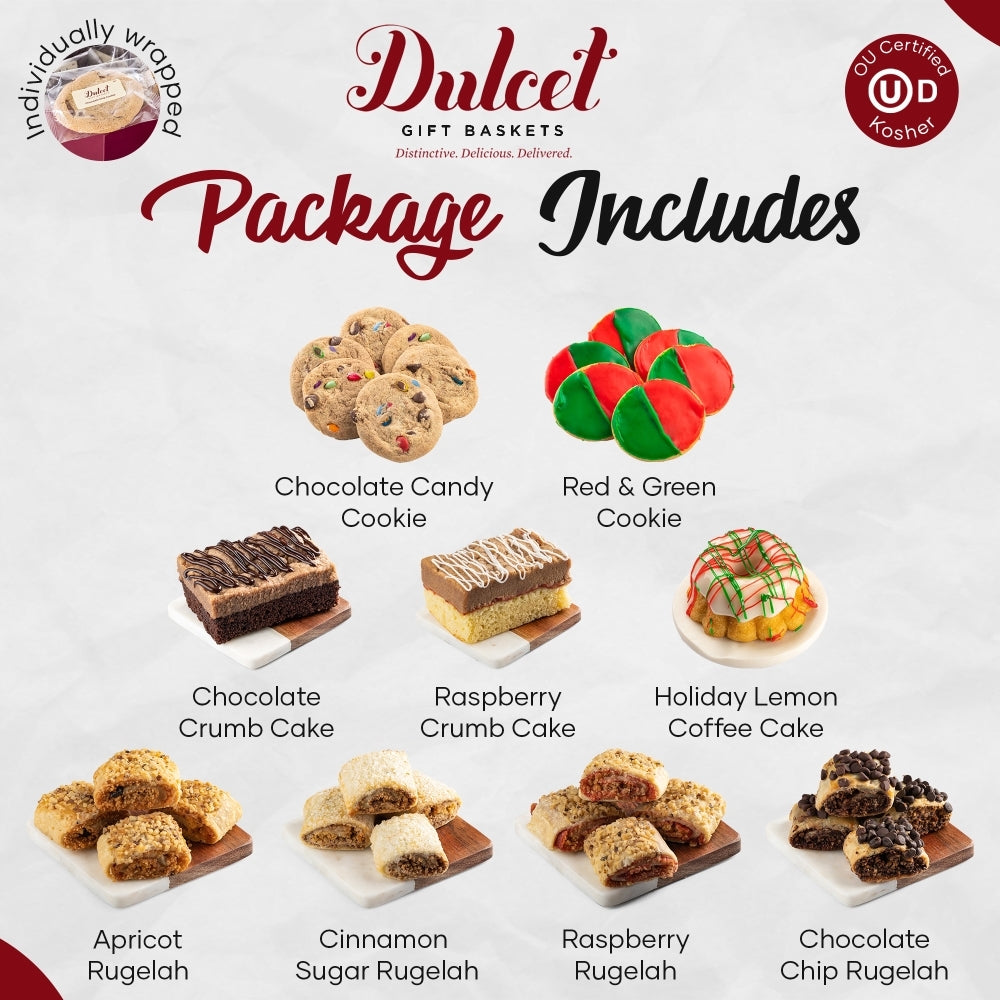 xCelebrate the holiday season in style with our exclusive deluxe gift basket, perfect for sharing joy with friends and family. This exceptional holiday gift features an array of brightly decorated cookies, luscious glazed mini bundts, and a selection of assorted rugelach, all freshly baked to perfection. Each treat is individually packed for freshness and presented in an elegant stack of tin and cardboard boxes. Add a personal touch with your own note, making this sumptuous gift impossible to resist. Ideal for festive gatherings, this gourmet basket is a thoughtful and delicious way to spread holiday cheer.