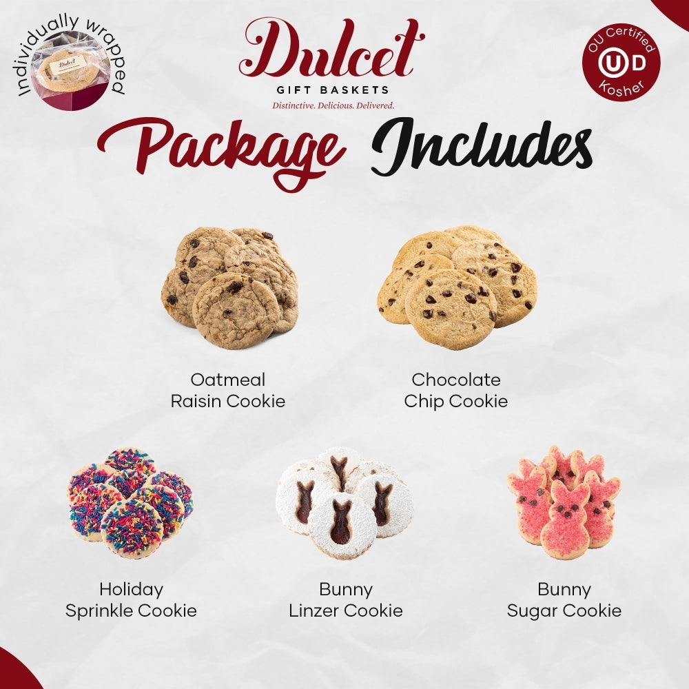 Discover the ultimate Easter gift box, crafted to be the centerpiece of any celebration. Overflowing with an exquisite selection of mouthwatering cookies, this gift basket is a must-have Easter treat. Whether you're hosting a family gathering or attending a festive event, our joyful Easter surprise promises to delight and excite everyone. Elegantly packaged in a brown paper box with a distinctive Dulcet-stamped sticker, it's ready to amaze your loved ones. Share the joy with this delightful assortment of scrumptious cookies, each one individually wrapped for freshness and irresistible taste. Ideal as a gift for parents, friends, or anyone with a sweet tooth, this charming cookie collection is a thoughtful gift idea that won't go unnoticed. Includes a pack of 12 delectable cookies.