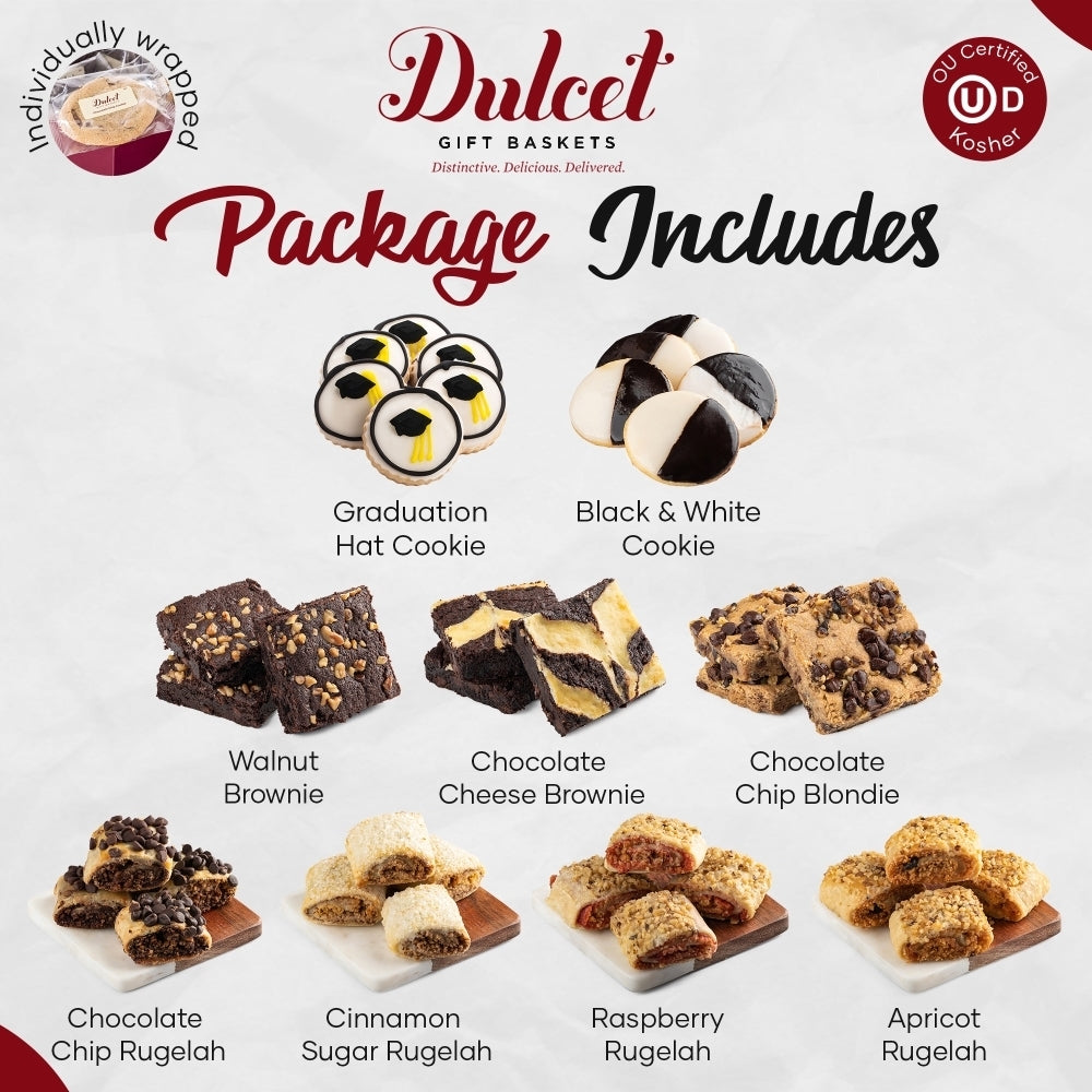 xCelebrate the special milestone of graduation with our exquisite Graduation Gift Basket, a perfect blend of elegance and quality. This thoughtfully curated basket is brimming with a variety of unique, hand-designed treats that promise to satisfy any sweet tooth. Among the delightful contents, you'll find charming graduation hats and mini black and white delicacies, making it an ideal gift for graduates. Designed with convenience in mind, these baskets are perfect for presenting at the ceremony, or you can choose to have us deliver it directly to the recipient, complete with a personalized message.
