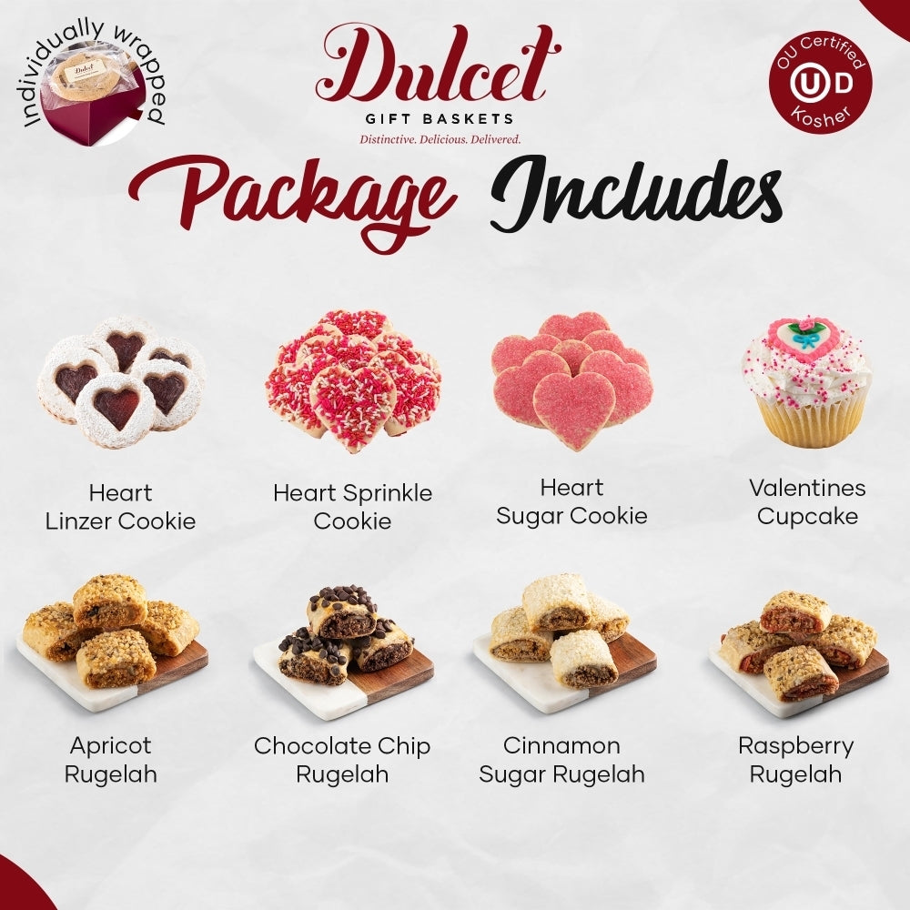 xSurprise your loved one with our exquisite Valentine's Gift Basket Gourmet, a delightful collection designed to touch their heart. This luxurious basket features the finest hand-frosted cookies and cake, each festively decorated and sprinkled with a luscious blend of crumbs, sugar, and icing for an indulgent experience. Enjoy the unforgettable taste of flaky rugelach, crafted to perfection for a gourmet treat that lingers on the palate. Presented in our elegant signature box, wrapped with the utmost care, this gift basket is the perfect way to express your love and create cherished memories this Valentine's Day.