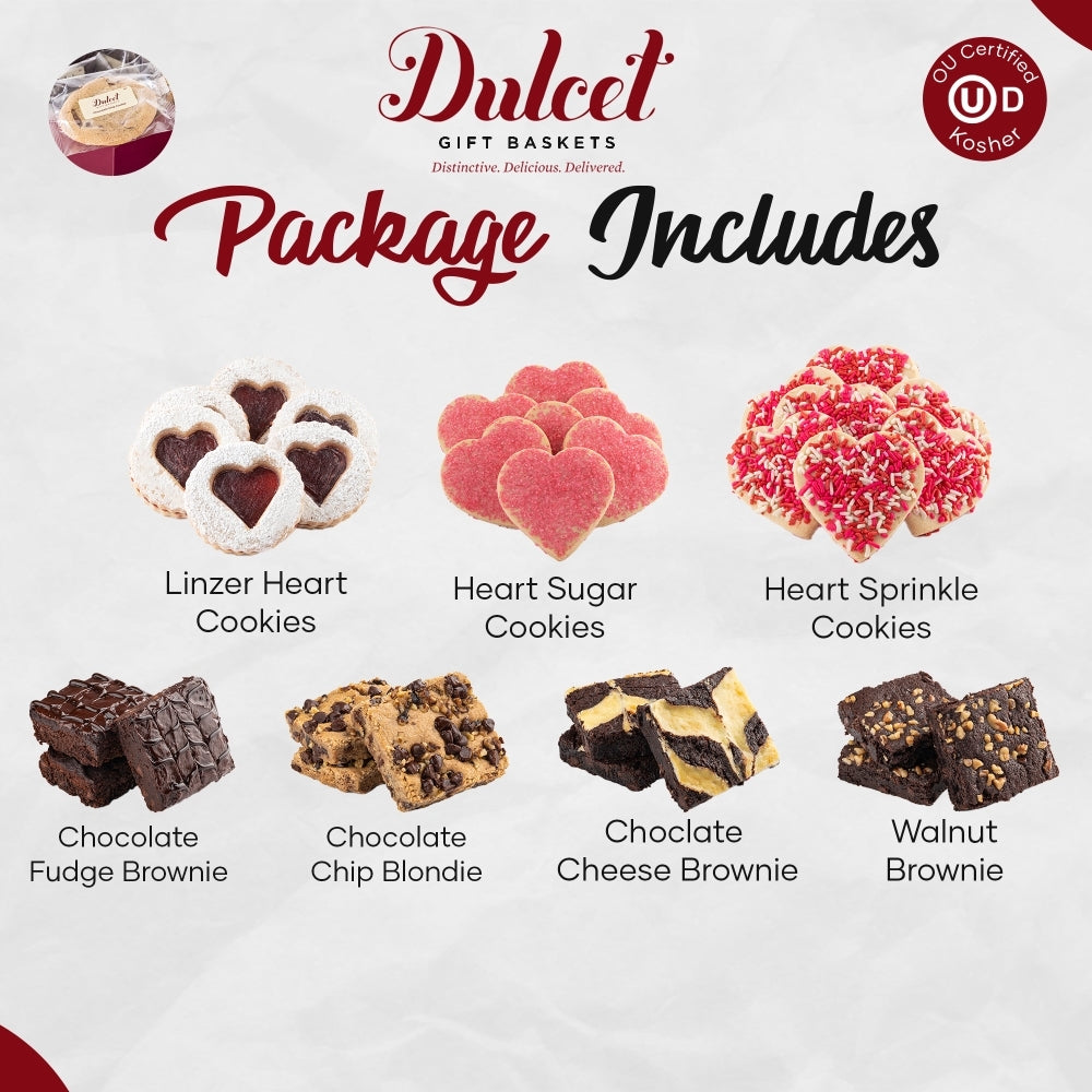 xDelight your loved one this Valentine's Day with a thoughtfully curated gift box, crafted by our skilled bakers to express your affection in the sweetest way. Nestled inside a chic Kraft box, you'll discover an irresistible assortment: pink iced heart-shaped cookies, traditional Linzer tart cookies with charming heart-shaped centers, and decadent brownies. Each element of this delightful collection is lovingly encircled with our signature ribbon, making it an ideal Valentine's Day gift that speaks from the heart.