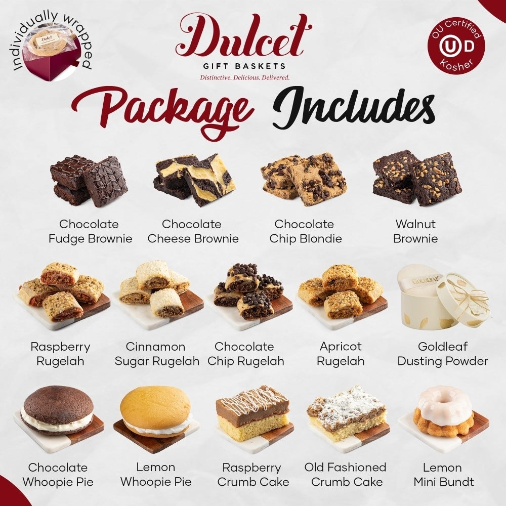 xDelight your loved ones with an exquisite assortment of baked delicacies, the ideal hostess gift for family gatherings or festive occasions. This collection is overflowing with beloved treats, including gourmet fudge brownies, a classic New York-style whoopee pie, and a mini lemon decadence cake, all enhanced by a luxurious, heavenly-scented dusting powder. With such a wide array of mouthwatering goodies, there's a delightful surprise for every palate.