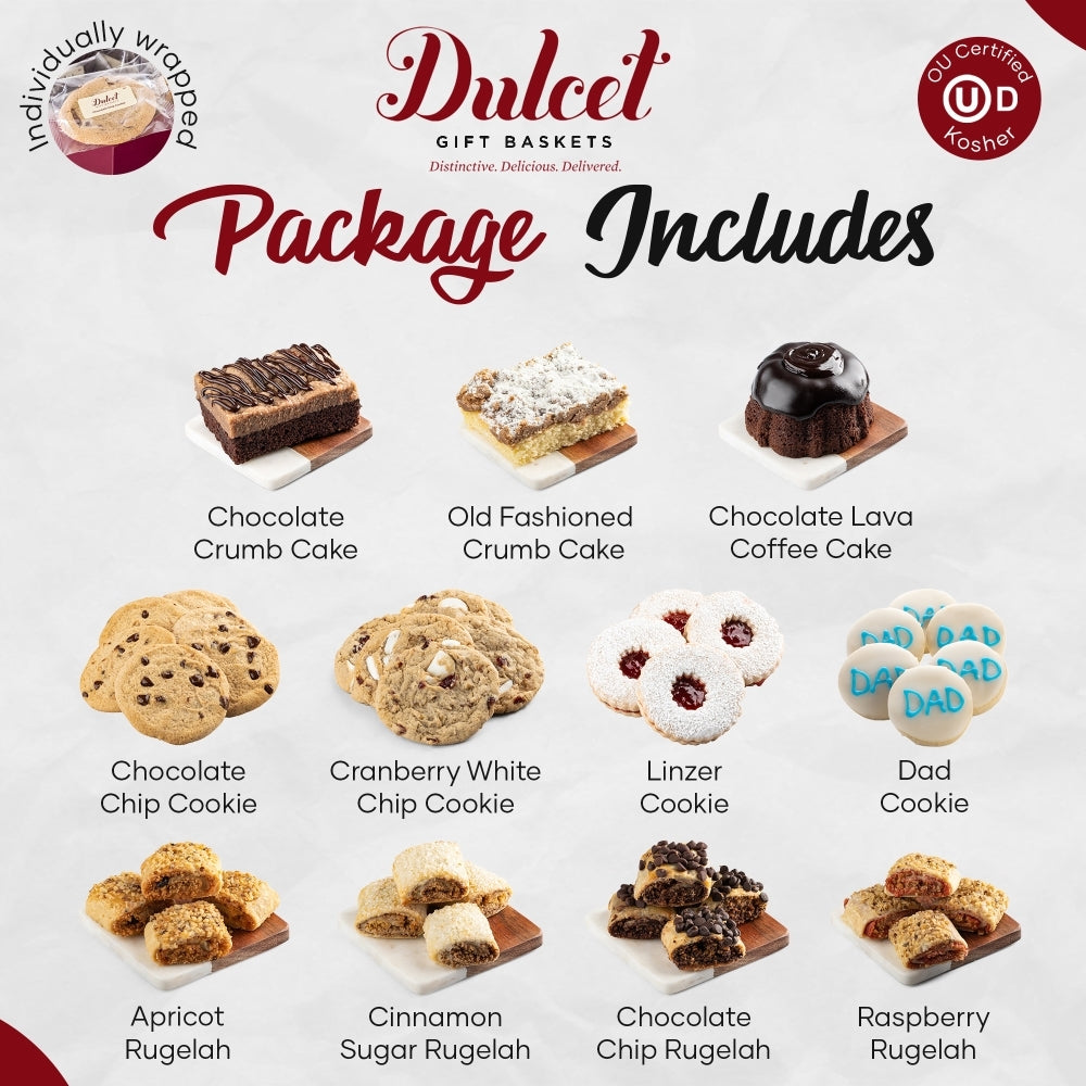 Delight your dad this Father's Day with our specially curated Happy Father's Day Gift Tin, brimming with a delectable assortment of fresh bakery treats. If you're on the hunt for the perfect gift to show your appreciation, look no further. This thoughtfully assembled gift tin features an exquisite selection of premium baked goods, including rich Crumb Cake, delightful Mini Bundt cakes, traditional Rugelach, and an assortment of scrumptious Cookies. Each item has been chosen to appeal to the discerning tastes of that special man in your life, ensuring a memorable celebration.