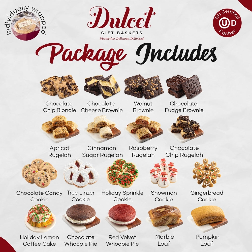 xDelight your loved ones this holiday season with a thoughtfully curated Christmas treat assortment from Dulcet. This exquisite gift set is designed to tantalize taste buds and leave them craving more. Inside a charming cardboard box, you'll discover a selection of mouthwatering delights, including zesty lemon glazed bundts and a variety of homemade cookies, all crafted to perfection. Ideal for adding a touch of sweetness to any festive celebration, this assortment promises to be the highlight of the holiday festivities.