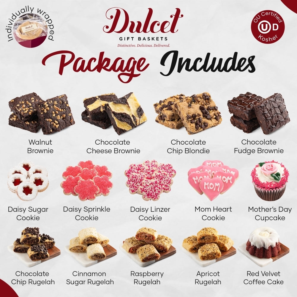 xShow your mom how much she means to you with the Dulcet Sweet Confection Gift Basket, a perfect blend of freshness and delectable taste. This exquisite gift includes delightful flower-topped cupcakes, luscious raspberry-infused Linzer tarts, and charming ice pink cookies, all crafted from the finest ingredients to ensure a premium experience. Thoughtfully packaged in our signature cardboard box, this gift basket offers the option to add a personalized message, making it an unforgettable present for any occasion. Treat your mom to a gift that will make her heart flutter and her taste buds dance!