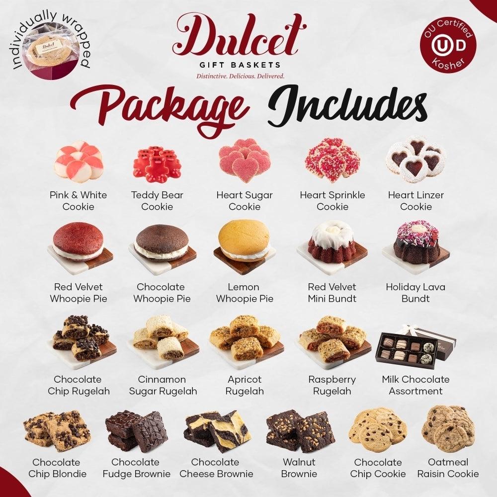 Delight your loved one this Valentine's Day with our luxurious two-tiered gift basket, a perfect expression of affection and warmth. This exquisite collection features two elegant burgundy board boxes filled with Dulcet's finest baked treats. Indulge in the sweetness of glazed mini bundts, savor the richness of fine Belgian chocolates, and enjoy the flaky goodness of assorted rugalach. Our romantic gift basket is the ultimate choice for expressing love, and with our fast and guaranteed shipping, it's never been easier to make this Valentine's Day truly special.