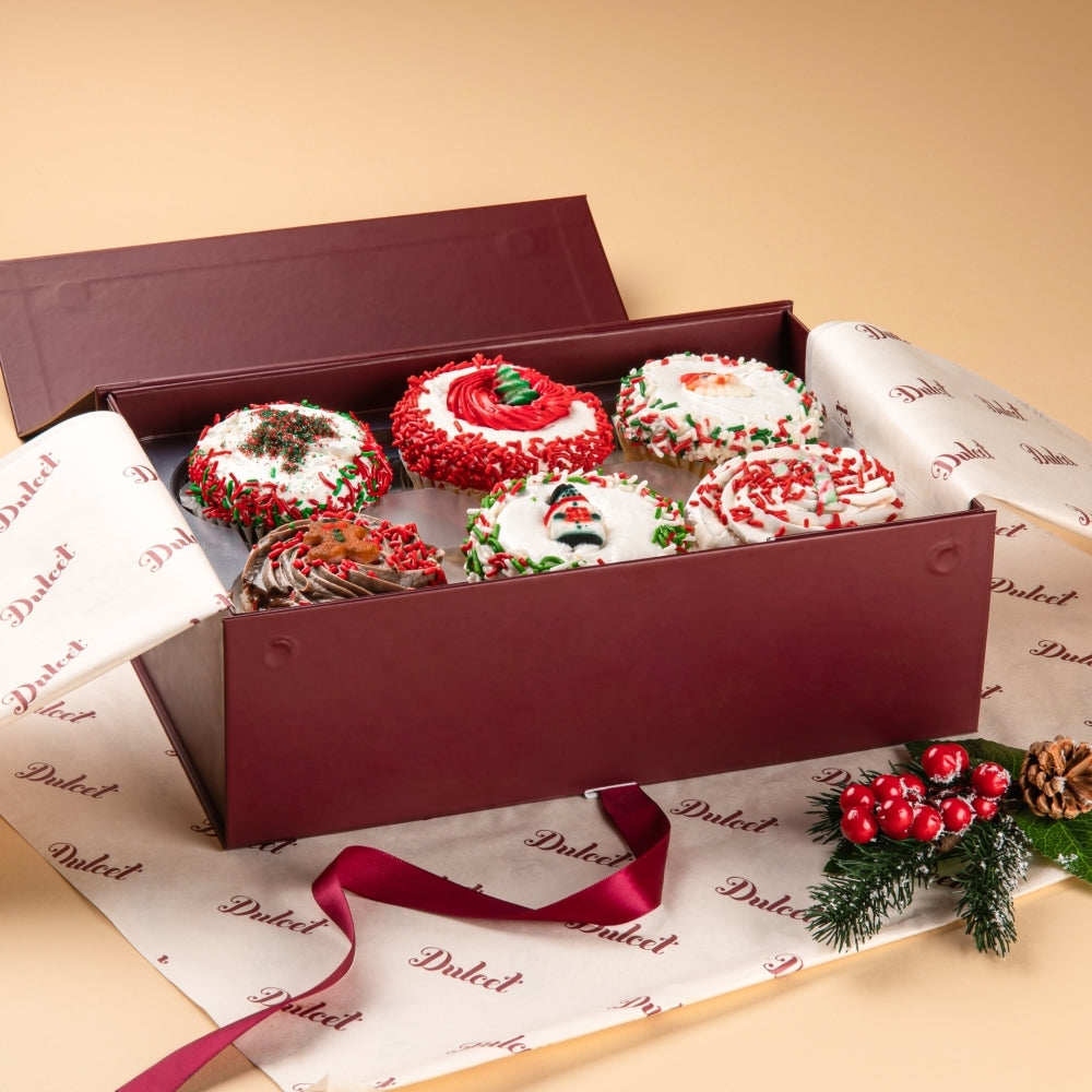 Spread the joy of the season with our exquisite Gourmet Holiday Cupcake Collection, a perfect gift to delight any sweet tooth. This festive assortment features an array of delectable flavors, from rich chocolate and airy vanilla to classic red velvet. Each cupcake is artfully adorned with a mix of whipped cream, buttercream, icing, and frosting, creating an elegant and mouthwatering treat. To add a touch of festive flair, they are garnished with sprinkles, crumbs, and chocolate chips. Presented in our signature gift-ready box, this gourmet gift basket is the ultimate holiday indulgence. Celebrate the season with a taste of luxury and sweetness!