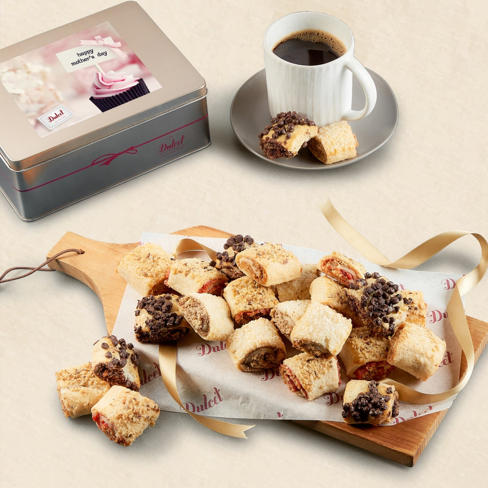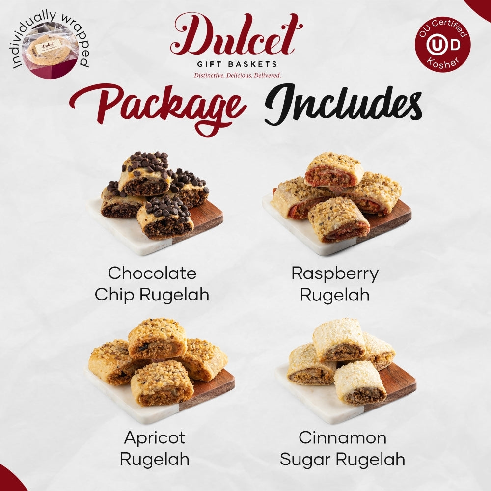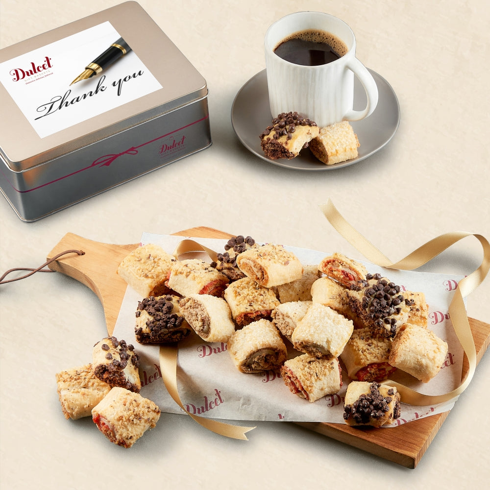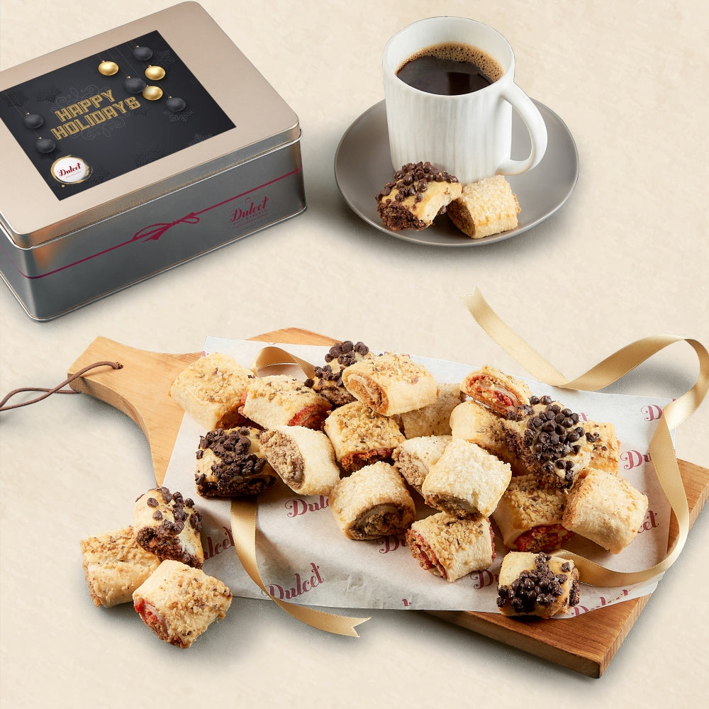 xIndulge in the delightful world of rugelach, where buttery, melt-in-your-mouth pastries await in an elegant tin. Each flaky pinwheel is a delicious masterpiece, offering a variety of irresistible flavors. Savor the sweet harmony of cherry charm, chocolate explosion, and cinnamon spice, all crafted to perfection. Presented with a luxurious satin ribbon featuring our logo, this stunning gift is sure to make a memorable impression. Perfect for any occasion, this gourmet rugelach collection promises a taste experience like no other.