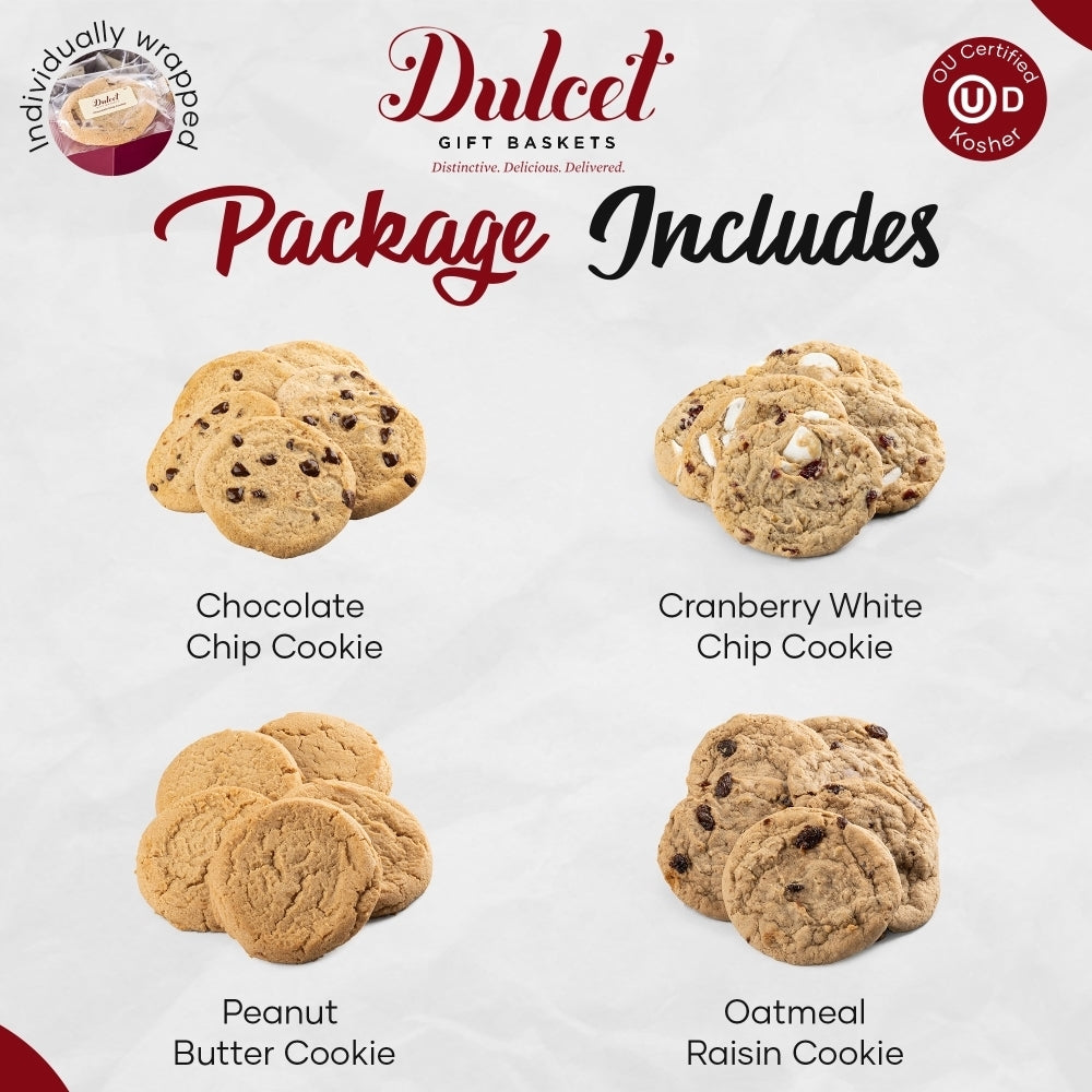 xDiscover the ultimate indulgence with Dulcet’s Assorted Cookie Gift Box, a delightful collection that promises to satisfy every sweet tooth. Perfect for gifting, this elegantly wrapped box, complete with a charming bow, is a feast for the eyes and the taste buds. Inside, you'll find an irresistible assortment of flavors: the rich and chewy peanut butter, the sweet and tangy cranberry white chip, the decadent chunky chocolate rock, and the classic wholesome oatmeal raisin. Whether you're celebrating a special occasion or simply treating someone you love, this cookie gift box is sure to impress and delight.