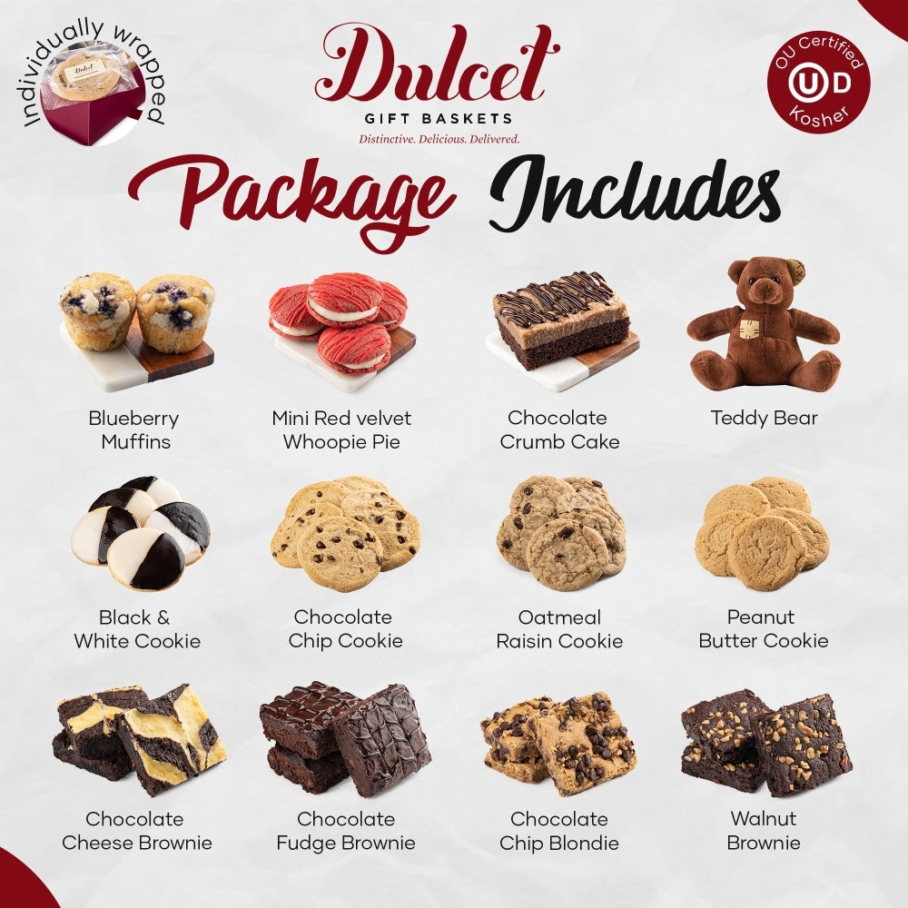 Surprise your loved ones with the ultimate get well soon gift basket, brimming with gourmet baked treats that make recovery a little sweeter. Whether they're feeling under the weather, recuperating in a hospital, or healing from surgery, our Gourmet Get Well Soon Dulcet Gift Baskets offer the perfect gesture of support and encouragement. Each tin gift box, lovingly crafted in our bakery with the finest ingredients, is Kosher-friendly and includes a charming teddy bear to serve as a lasting memento of your thoughtful gesture. Brighten their day and wish them a speedy recovery with this heartwarming gift.