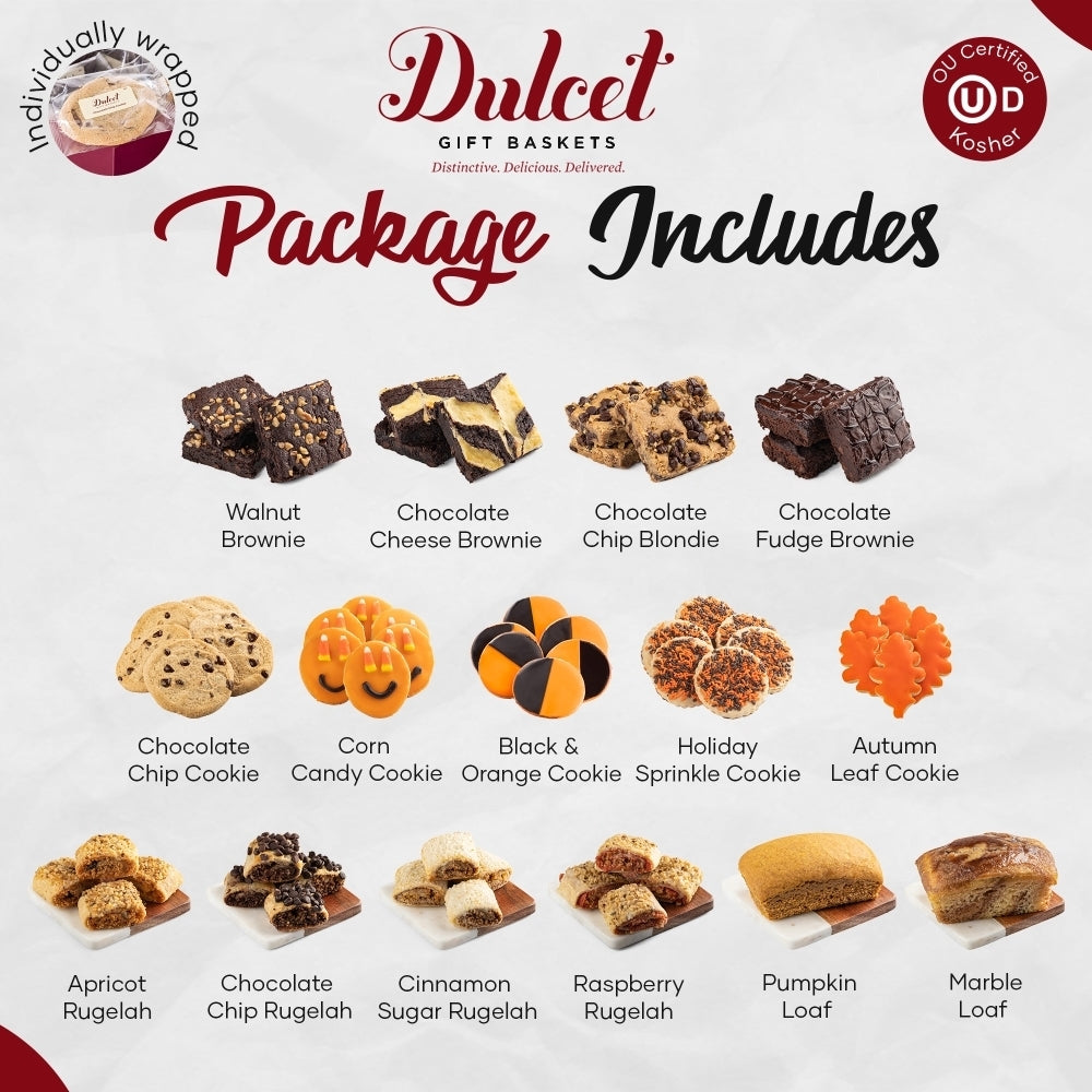 Delight in the ultimate Halloween gift experience with Dulcet's irresistible offering! This exquisite set features two elegantly stacked signature cardboard boxes, brimming with festive baked treats that capture the essence of the holiday. Indulge in the rich flavors of rustic pumpkin loaves, savor the warmth of cinnamon-spiced cookies, and enjoy the playful contrast of orange and black cookie rounds. Perfect for gifting, simply add your personal message to create a memorable surprise that will be cherished. Elevate your Halloween celebrations with these fresh, flavorful delights that promise to impress.