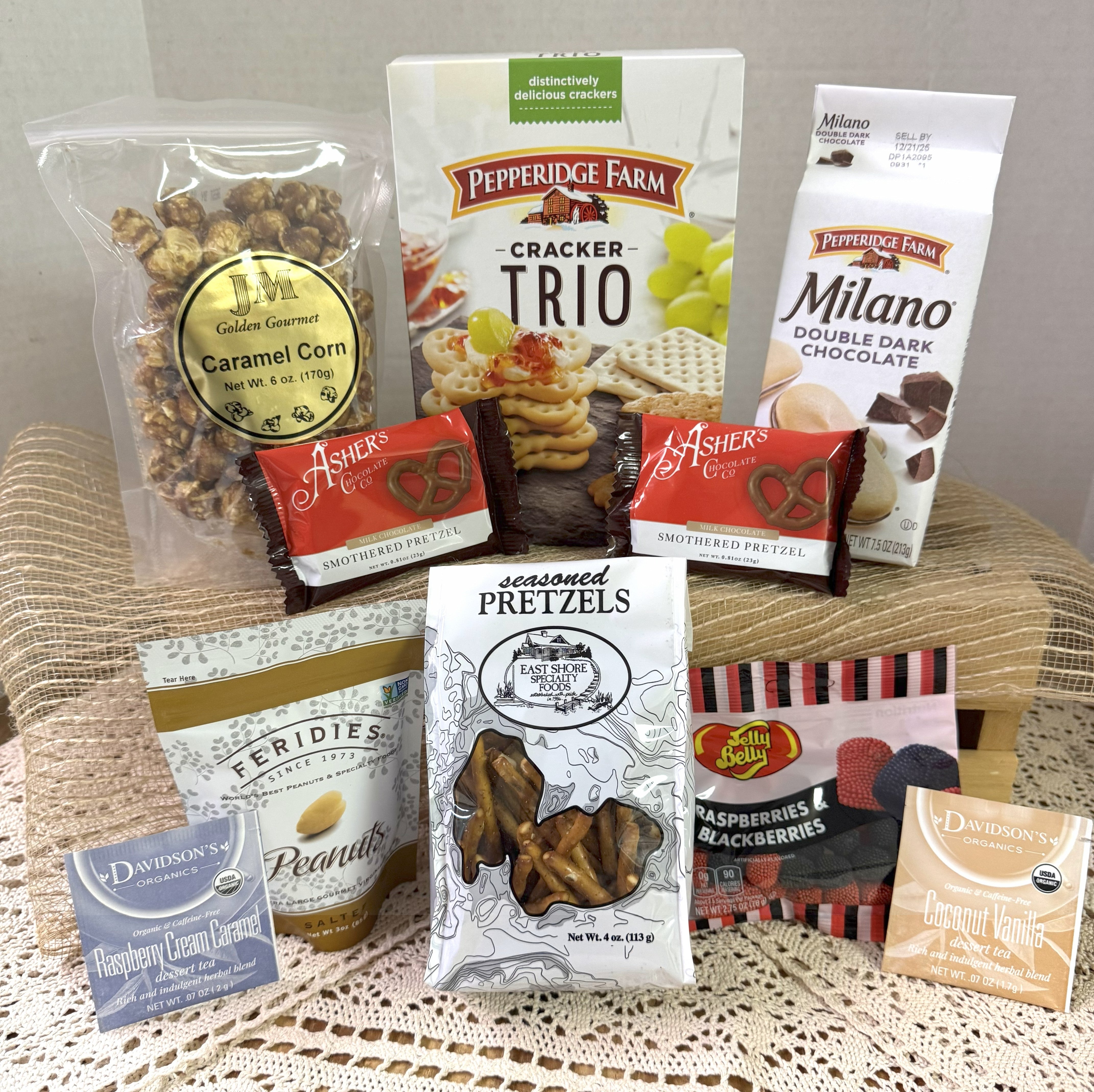 Inside this thoughtfully curated gift basket, you'll discover a delightful assortment of gourmet treats that promise to tantalize your taste buds. Indulge in the savory crunch of Pepperidge Farm Crackers, perfectly paired with the rich, buttery flavor of Milanos Cookies. For those who enjoy a touch of nutty goodness, Feridies Peanuts offer a satisfying crunch, while seasoned pretzels provide a savory twist.
