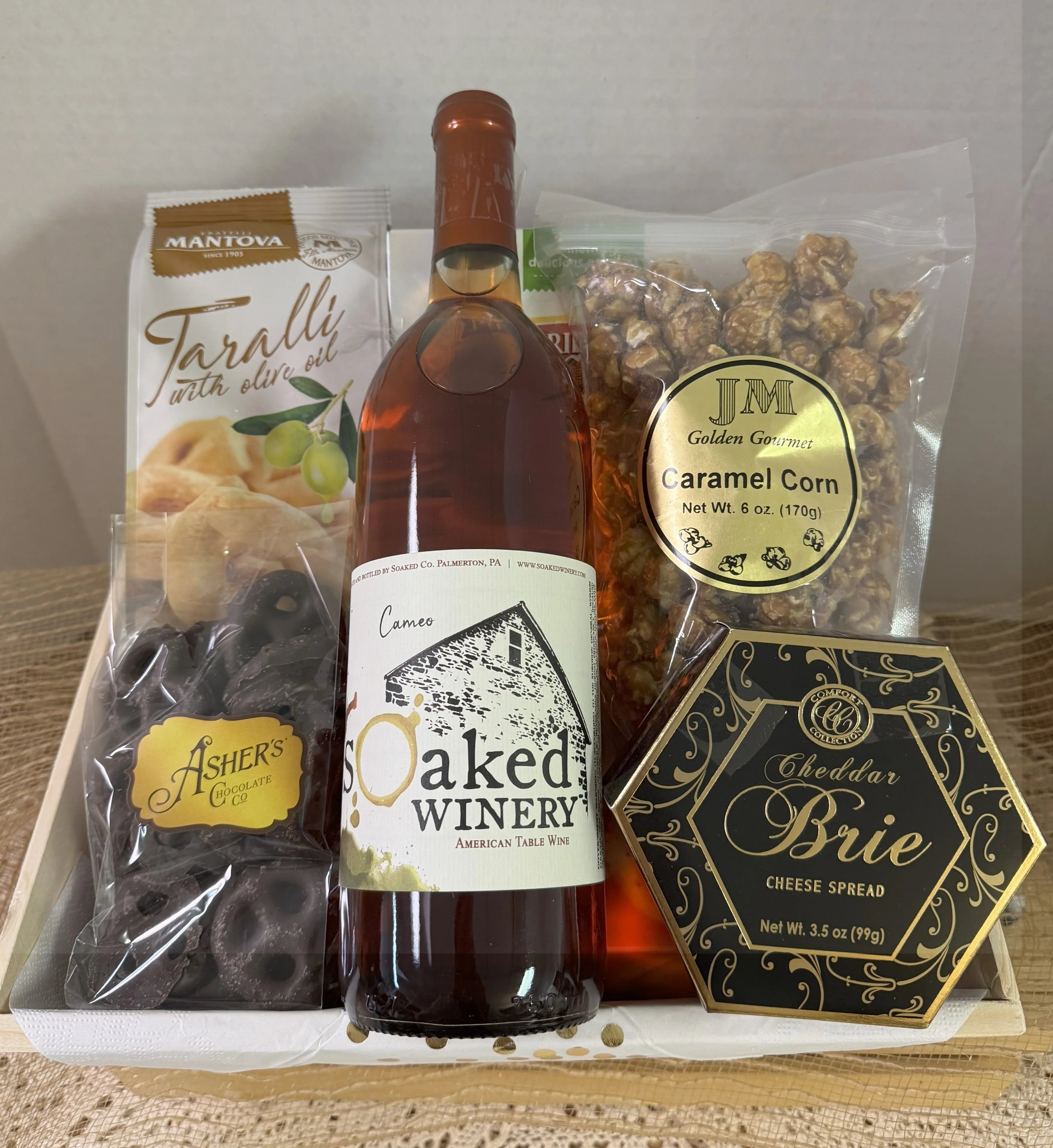 Each component of the basket is selected with care, ensuring that the flavors and textures complement each other perfectly. The wines are chosen for their quality and ability to pair well with the included snacks, creating a cohesive and enjoyable tasting experience. The addition of gourmet crackers and cheese provides a savory element, while the caramel popcorn and chocolates add a touch of sweetness, making this basket a well-rounded and satisfying gift.