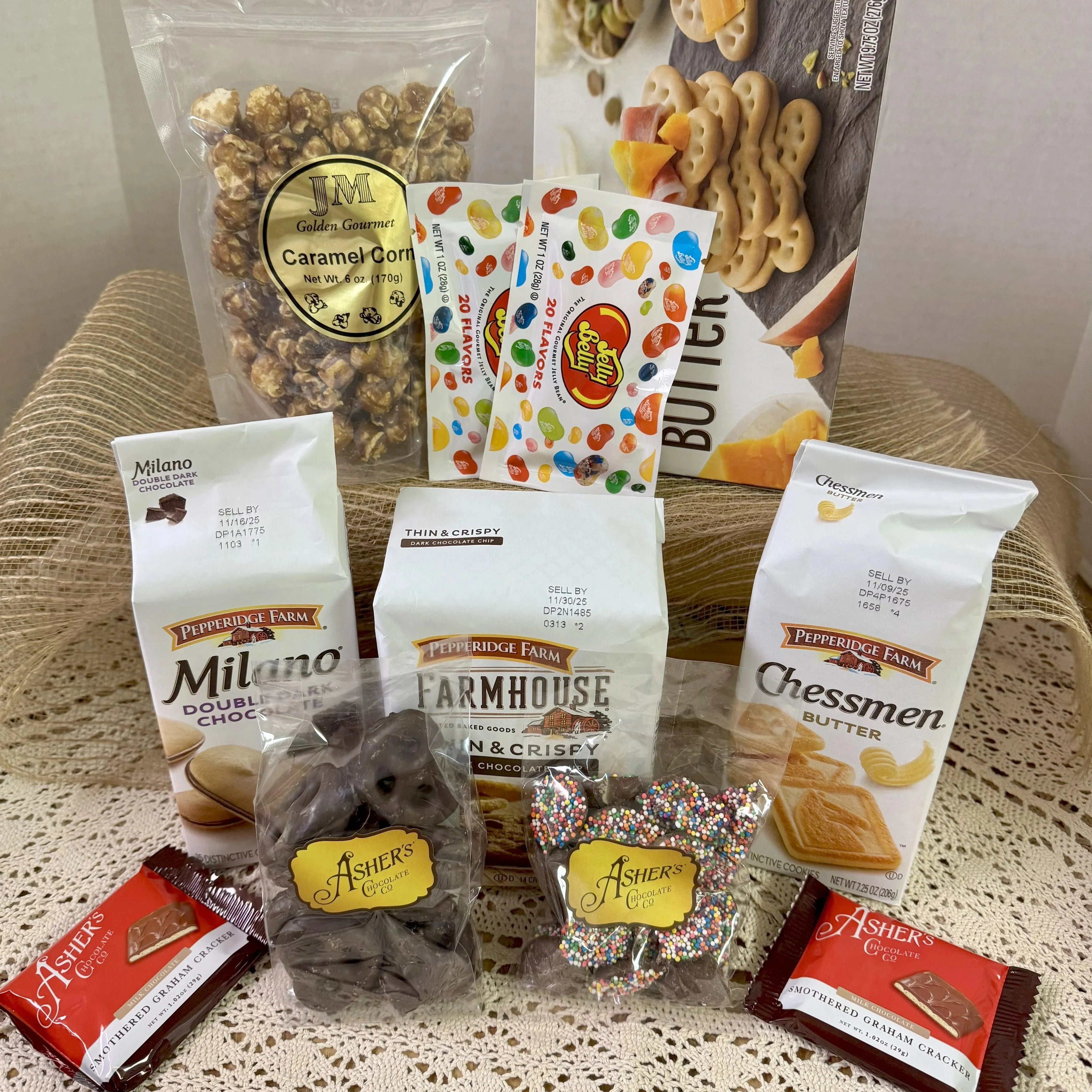 Sweet - Satisfy your sweet tooth with a variety of Pepperidge Farm Crackers, Milano Cookies, Chessmen cookies, and Farmhouse chocolate chip cookies. Additionally, enjoy caramel popcorn, a bag of Asher's Nonpareils, Asher's sea salt caramels, and two chocolate-covered pretzels.