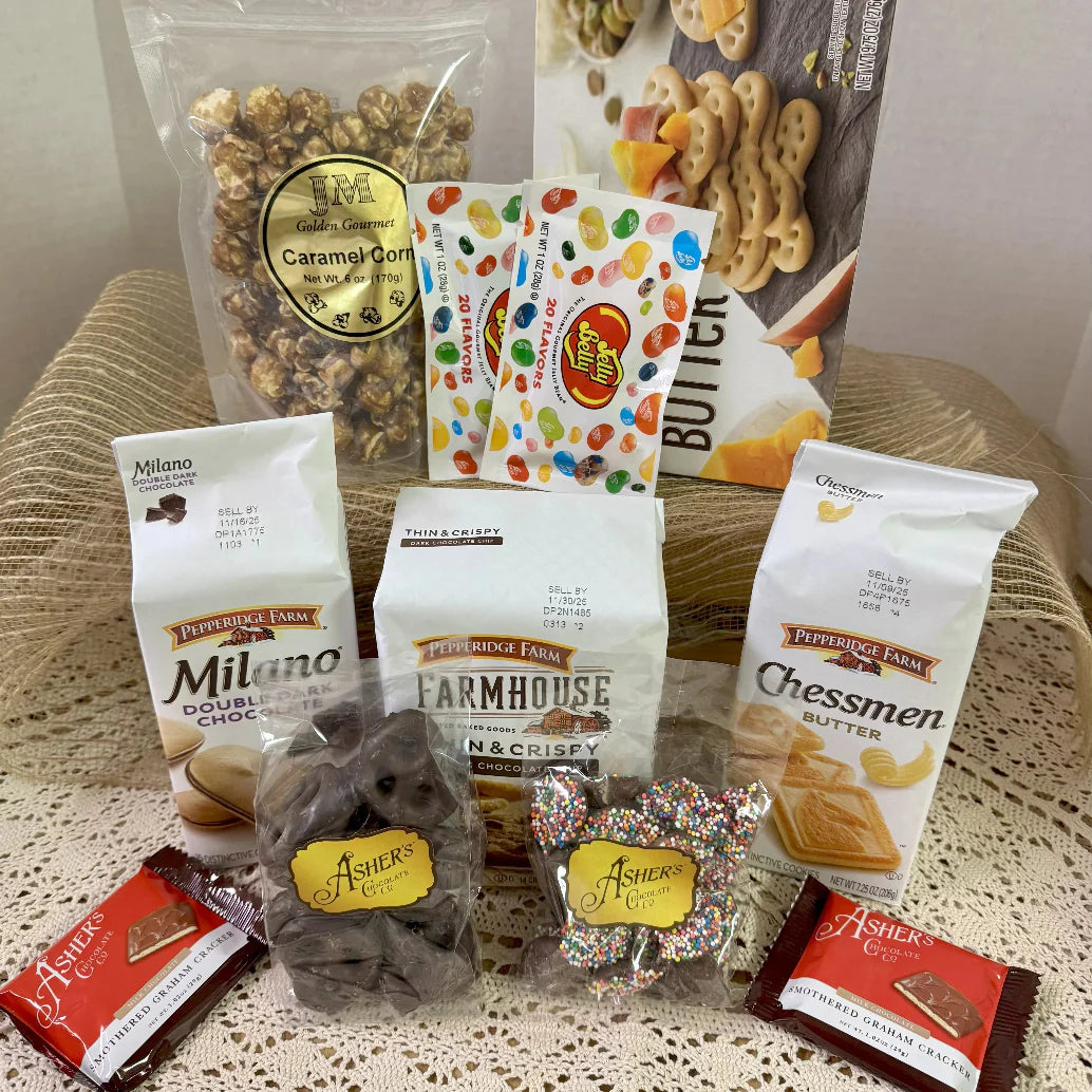 xCelebrate the Philadelphia Eagles' victorious legacy with the exclusive 2 X Super Bowl Champions Gift Tin Basket. This American-made gift basket is a must-have for any Eagles fan, combining team pride with a delightful assortment of snacks. Perfect for enhancing your fan cave or as a thoughtful gift, this basket is a testament to your unwavering support for the Eagles. The gift basket is available in two delicious options: Savory and Sweet, each carefully curated to satisfy diverse taste preferences. The Savory option includes a delectable selection of Pepperidge Farm Crackers, 5 o'clock Crunch mix, seasoned pretzels, a bag of jerky, Pepperidge Farm Goldfish, honey mustard pretzels, Heat of the Beast mix, and two chocolate-covered pretzels. This assortment is perfect for those who enjoy a variety of flavors and textures. For those with a sweet tooth, the Sweet option features Pepperidge Farm Crackers, Milano Cookies, Chessmen cookies, and Farmhouse chocolate chip cookies. It also includes caramel popcorn, Asher's Nonpareils, Asher's sea salt caramels, and two chocolate-covered pretzels, sure to delight any dessert lover. Each officially licensed basket measures 8.25" in height with a 6" diameter, making it compact yet spacious enough to hold a variety of snacks. Whether you're treating yourself or gifting it to a fellow fan, this gift basket is a perfect choice for celebrating Eagles' victories in style. Explore our gift basket delivery and gift crate delivery options to bring this unique piece of Eagles memorabilia to your doorstep.