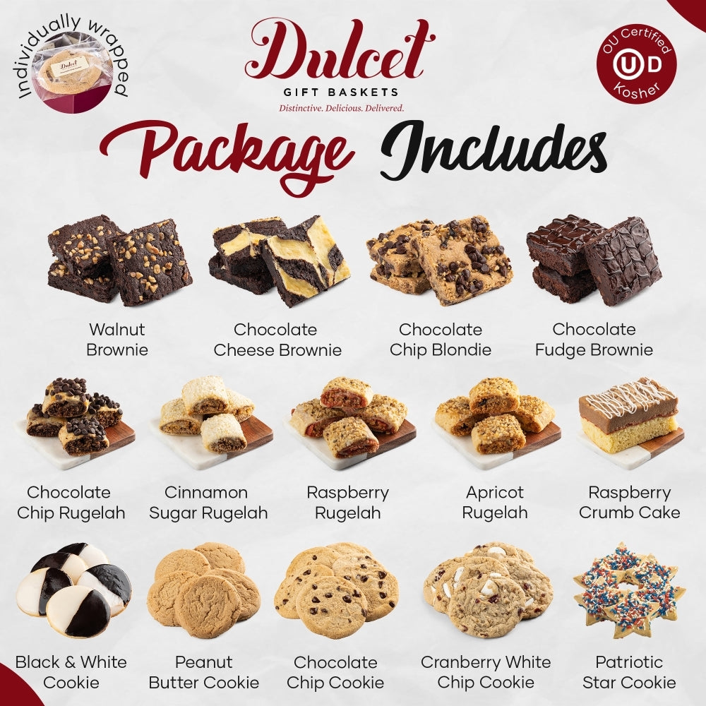Make a memorable impression at your July 4th celebration by gifting your host with this exquisite bakery gift basket. Nestled within a charming rustic tin, your recipient will discover a delightful assortment of fresh pastries. Indulge in the tangy sweetness of raspberry crumb cakes, savor the creamy richness of black and white rounds, and enjoy a variety of cookies, each carefully packaged to preserve their freshness. Show your appreciation with this delectable treat that promises to delight and surprise.
