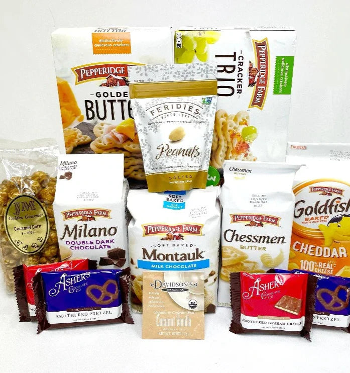 xThe Large Feel Better Soon Gift Box is a delightful gift basket designed to bring comfort and joy to anyone in need of a little pick-me-up. This thoughtfully curated gift basket features an array of premium Pepperidge Farm products, ensuring a delightful experience for the recipient. Indulge in the rich flavors of Pepperidge Farm Nantucket Cookies, paired perfectly with two varieties of their finest crackers. The iconic Goldfish snacks add a playful touch, loved by both children and adults alike. This gift crate delivery also includes a selection of delectable cookies, with options like Milano, Chessman, or Strawberry Verona, each crafted to perfection. To enhance the experience, we've included gourmet caramel popcorn, Feridies peanuts, and two chocolate-covered pretzels, offering a harmonious blend of sweet and savory delights. Two packets of Jelly Belly jellybeans and a soothing tea packet complete this exquisite gift basket, ensuring a variety of flavors and textures that will satisfy any palate. Our gift baskets are more than just a collection of treats; they are a testament to quality and care, making them the perfect choice for any occasion. Whether you're looking to brighten someone's day or convey your heartfelt sentiments, our gift basket delivery service ensures that your thoughtful gesture is received with joy. Trust in the quality and attention to detail that goes into every gift basket, and make a lasting impression with the Large Feel Better Soon Gift Box.