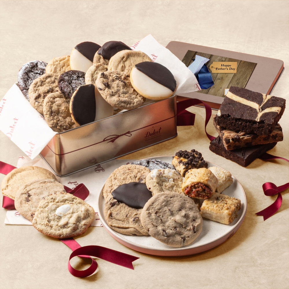 Experience the ultimate indulgence with Dulcet’s exquisite gift tin, where gourmet cookies and decadent brownies unite in perfect harmony. Nestled in a charming rustic tin, each cookie bite boasts a crispy exterior with a delightfully chewy interior, offering a divine taste sensation. Accompanied by luscious blocks of rich brownies and chunky chocolate chip cake, this assortment promises a star-rated treat for any occasion. Perfect as a gift or a personal indulgence, this collection of goodies is sure to impress and delight.