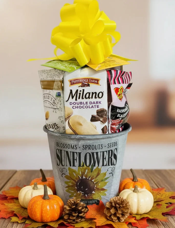 In conclusion, our Small Sunflower Gift Basket is a testament to the beauty and bounty of autumn. With its carefully selected treats and stunning presentation, it offers a unique way to celebrate the season. Whether you're enjoying it yourself or sharing it with others, this gift basket is a perfect embodiment of autumn's charm, ready to be delivered to your door with ease and grace.