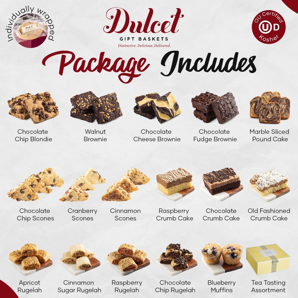 xDiscover a tower of delectable treats with Dulcet's gourmet gift set. The first layer unveils an irresistible selection of flavored crumb cakes, perfectly complemented by an assortment of fruity scones and rich brownies. Delve deeper to find a moist specialty marble loaf, accompanied by pudgy muffins and a generous box of premium tea. Each item is elegantly packaged, making this the ultimate hostess gift that truly stands out. Indulge in Dulcet's luxurious presentation and let this gift set be the highlight of any occasion!